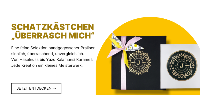 9 handgegossene Pralinen befinden sich in dieser Schatzkiste. 3x3 ausgwählte Köstlichkeiten für Sie zusammengestellt.3x Yuzu Kalamansi Karamell:Ausgewogen in jeder Beziehung. Mein Frucht Säure Verhältnis ist einfach unschlagbar. Ich bin ein Exot, Yuzu ist eine japanische Zitrusfrucht. Die Kalamansi stammt von den Philippinen und ist eine Kreuzung aus Mandarine und Kumquat. Eine wahre Geschmacksexplosion für jeden der Frucht und Butterkaramell liebt. Umhüllt werde ich von herrlicher Zartbitterkuvertüre. 3x Salzkaramell:Ich bin die klassische und reizvolle Kombination eines Butterkaramells und verfeinert mit bestem französischem Fleur de Sel. Das Fleur de Sel stammt ursprünglich von der Ile de Ré, einer Insel an der französischen Westküste und wird dort in allen Varianten verarbeitet, unter anderem im Karamell. Durch seinen feinen Geschmack, der für Salz ungewöhnlich mild ist, wird dem Karamell eine besondereNote verliehen, die sich auch in mir wiederspiegelt.3x Mango Maracuja Karamell:Ich erwecke deine Urlaubsgefühle...fremde Länder, wärmende Sonne, warmer Sand an deinen Füßen, das sanfte Rauschen des Ozeans und der Duft exotischer Früchte. Zwei dieser tropischen Früchte vereinen sich in mir; die Säure der Maracuja trifft dabei auf die Süße der Mango und verbindet sich zu einem wunderbaren Fruchtkaramell, das für eine anhaltende Geschmacksexplosion sorgt und zuhause sommerliche Erinnerungen weckt.*Alle Pralinen sind handgegossen und kunstvoll mit Kakaobutter bemalt. *Daher können Farbe und Muster von der Abbildung abweichen – jedes Stück ist ein kleines, handgemaltes Kunstwerk und ein Unikat. Täglich frisch zubereitet. Kühl und trocken lagern (nicht im Kühlschrank).